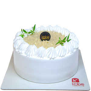 Fluffy vanilla sponge cake layered with fresh 100% durian flesh and durian chantilly cream. Decorated and frosted with fresh cream with some decor gold