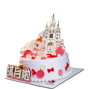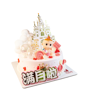 Get this lovely full moon cake for your baby girl. A vanilla chiffon with strawberry filling, topped with castle and cute little baby girl decoration.