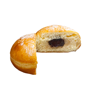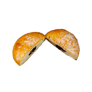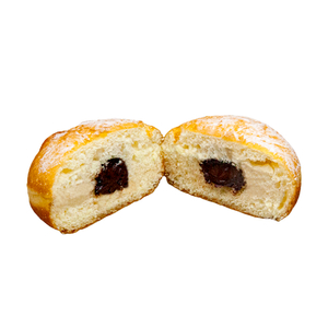 A soft,fluffy Italian-style doughnut is filled with rich, creamy chocolate and dusted with a light coating of sugar.